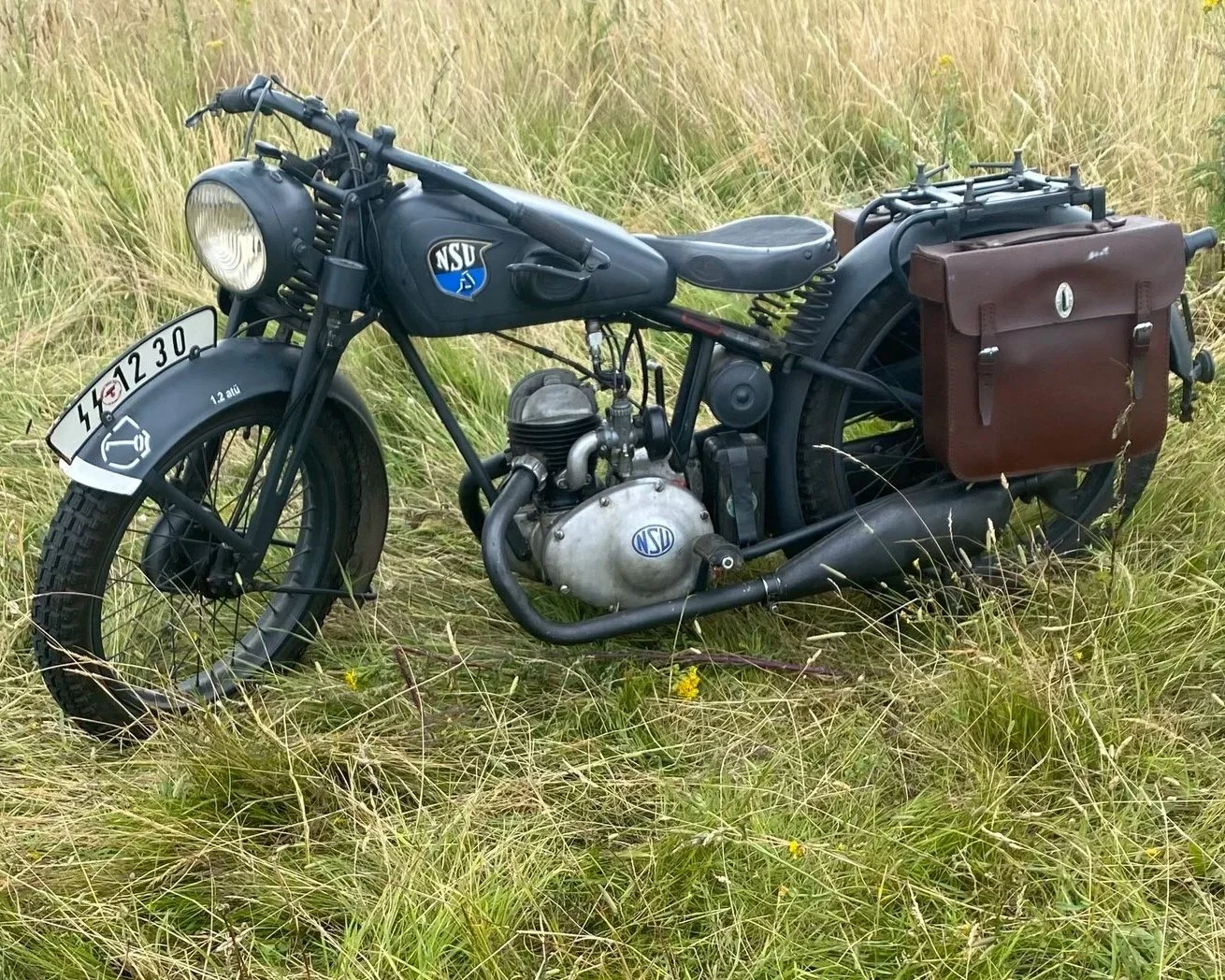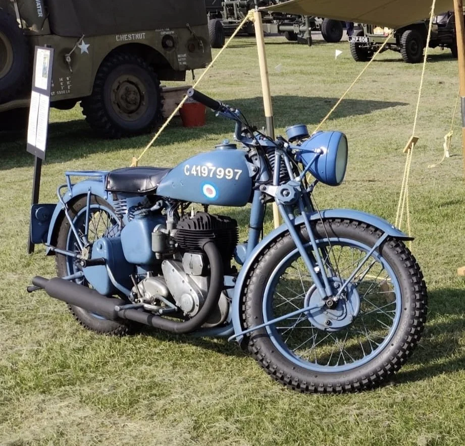 BMW R75 German WW2 Motorcycle and Sidecar complete with vehicle dressing and replica MG34 mounted. 1940 Royal Enfield Model C British Army Dispatch Riders Motorcycle US Army WW2 Harley-Davidson WLA WW2 RAF Dispatch Riders Motorcycle German 1939 NSU Motorcycle